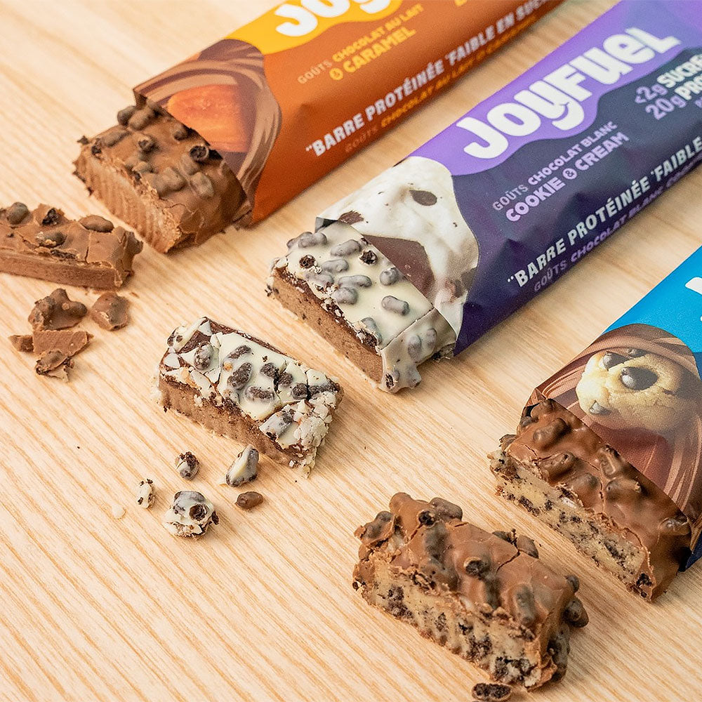 20 grammes de protéines, c’est ce qu’il y a dans une barre Joyfuel et c’est autant que dans 3 œufs (cf table ciqual). ! Goûts pâte à cookies, cookies au chocolat ou goût caramel, avec des billettes croustillantes... goûter les barres JF c'est les adopter !