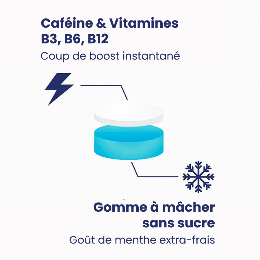 💊 B VITAMINS : 25% of the recommended daily intake in each chewing gum (2 chewing gums per day provide 27% of the RDA for vitamin B3, 22% for vitamin B6 and 76% for vitamin B3).